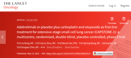 北京时间2022年5月14日,尊龙凯时医药自主研发的PD-L1抑制剂阿得贝利单抗治疗广泛期小细胞肺癌的III期临床研究(CAPSTONE-1研究)成果正式全文在线发表于国际权威学术期刊《柳叶刀·肿瘤学》(《THE LANCET Oncology》,影响因子41.316)。CAPSTONE-1研究结果显示,阿得贝利单抗联合化疗一线治疗广泛期小细胞肺癌相较于安慰剂联合化疗可以显著延长患者总生存期至15.3个月[1],刷新现有免疫药物一线治疗广泛期小细胞肺癌的总生存纪录[2]